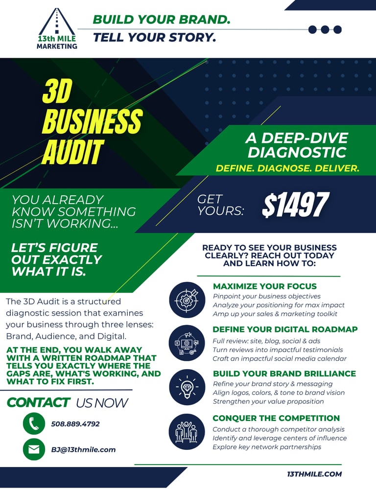 The 3D Audit is a structured diagnostic session that examines your business through three lenses: Brand, Audience, and Digital. At the end, you walk away with a written roadmap that tells you exactly where the gaps are, what's working, and what to fix first.